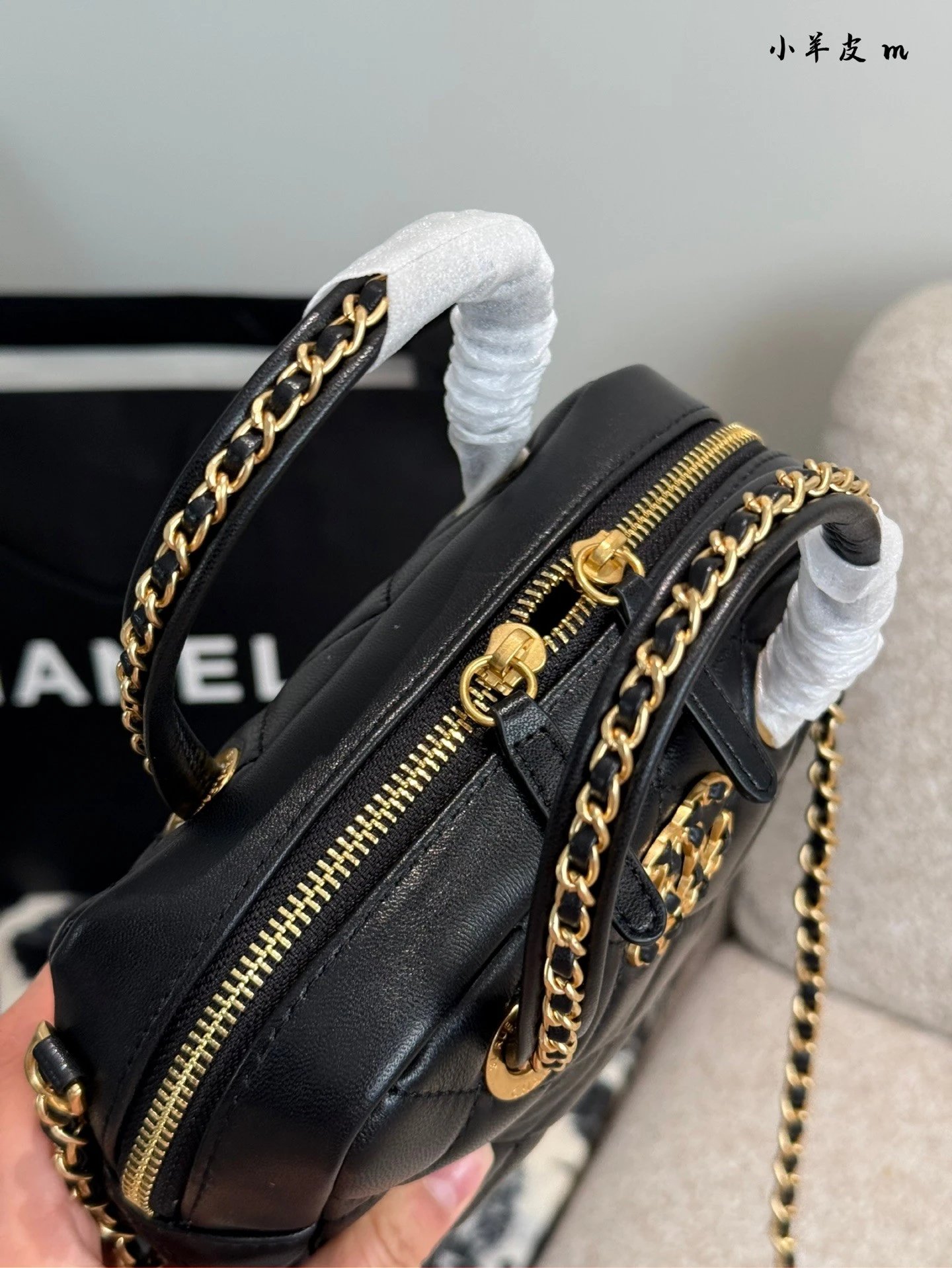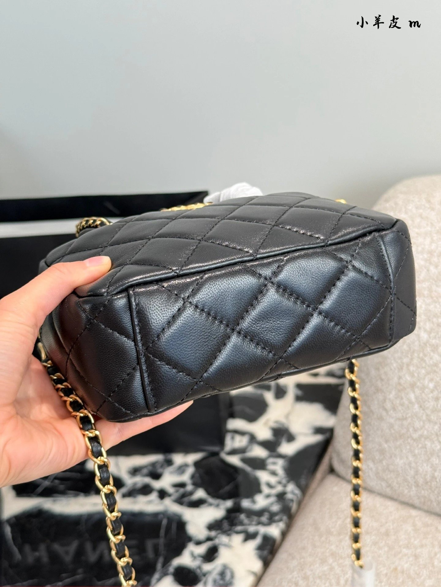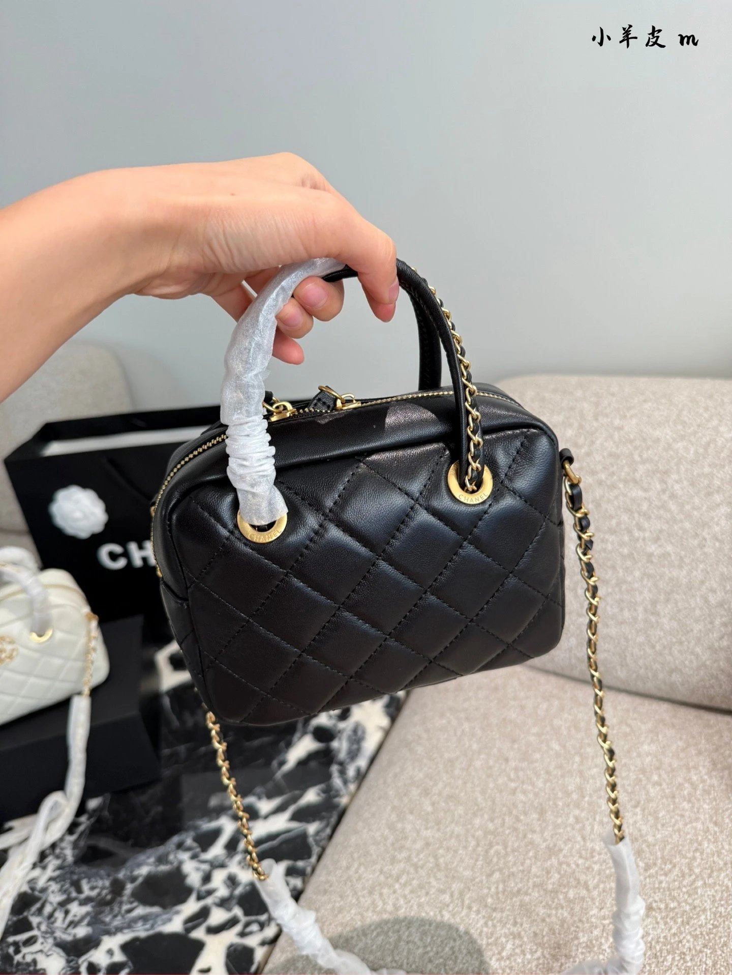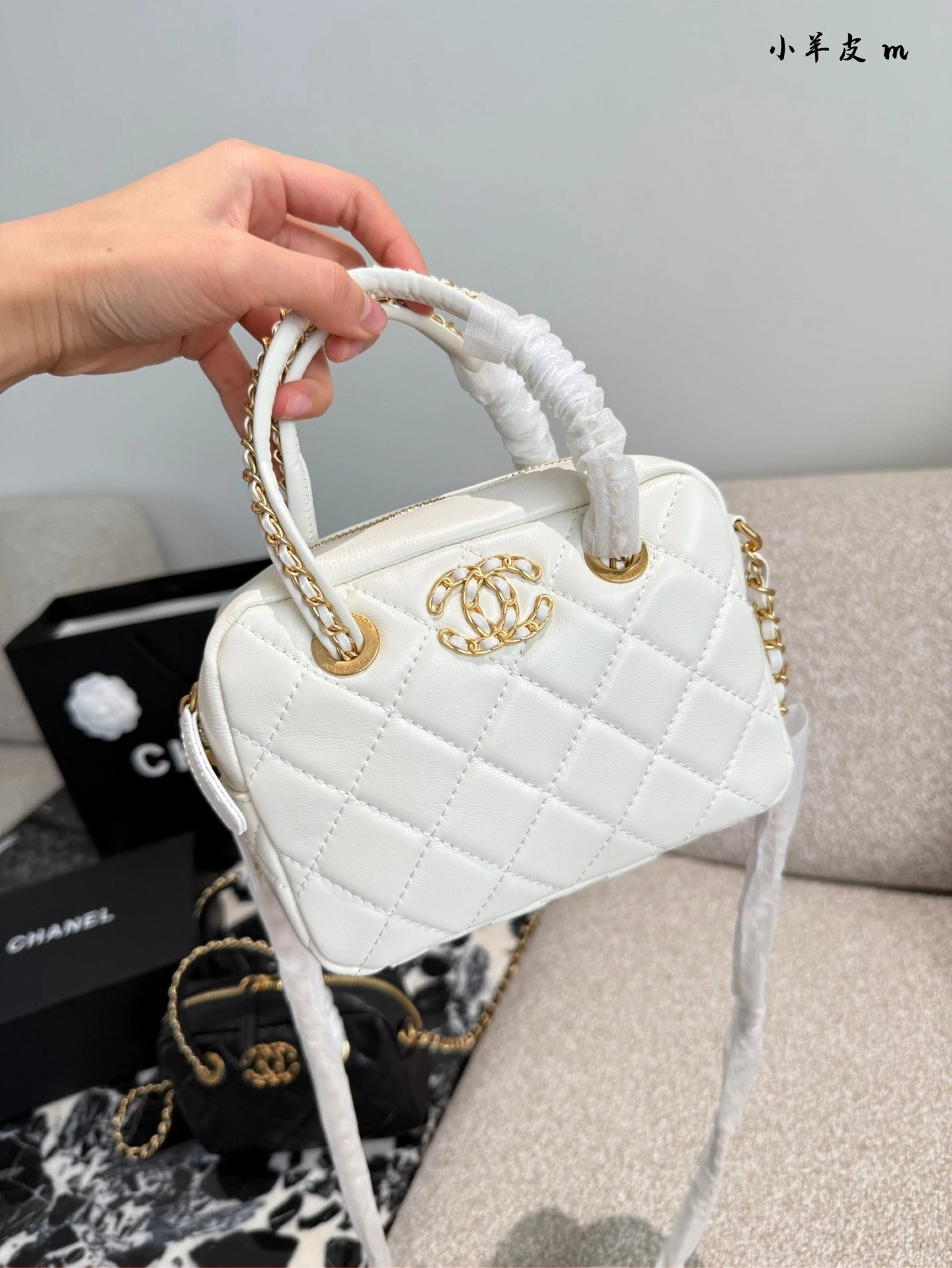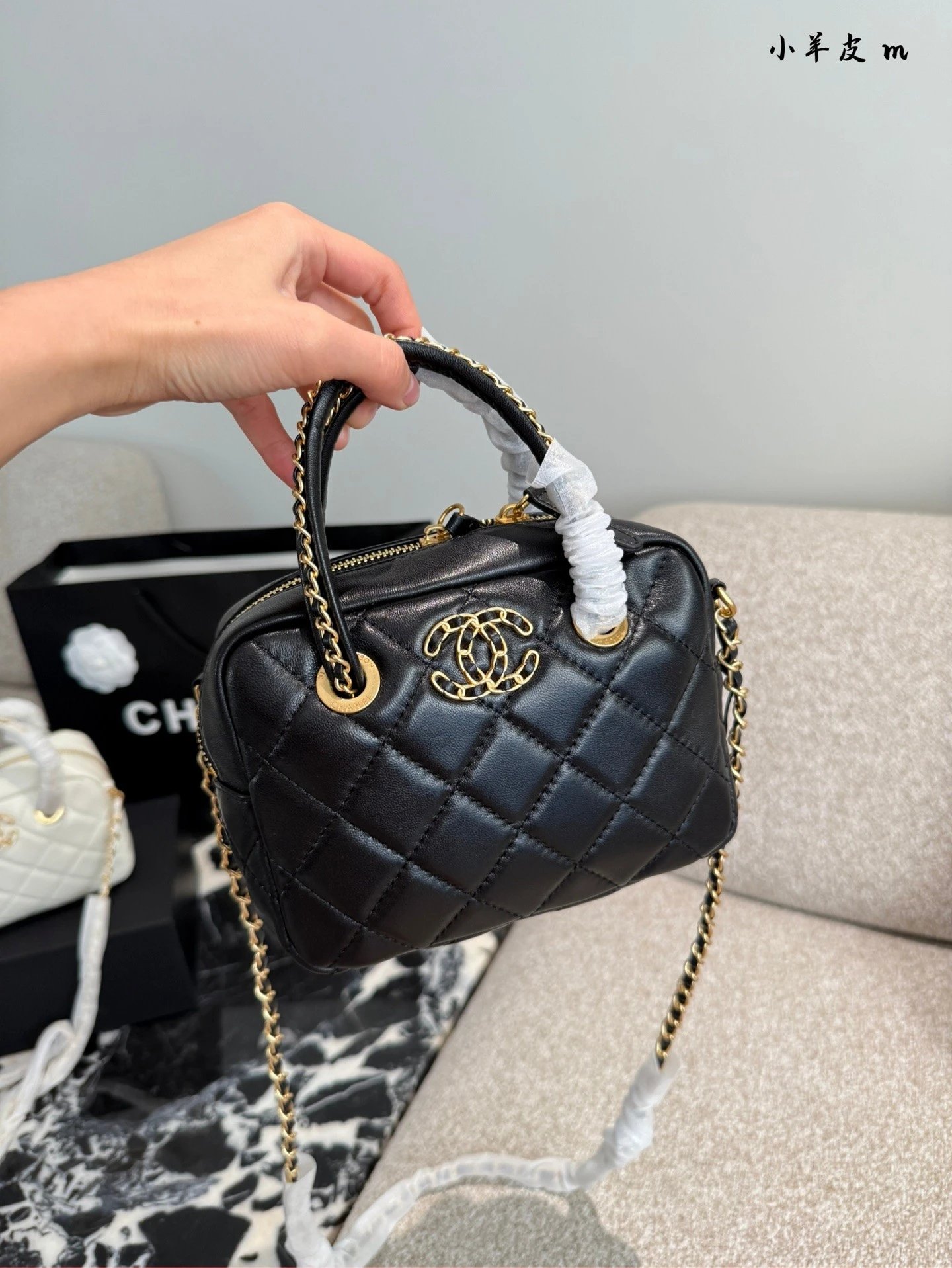 Alpha Home [Original Quality] 2025 New 25c Bowling Bag Classic Diamond Check Design Black Gold Woven Handle Leather Bag Light and cute