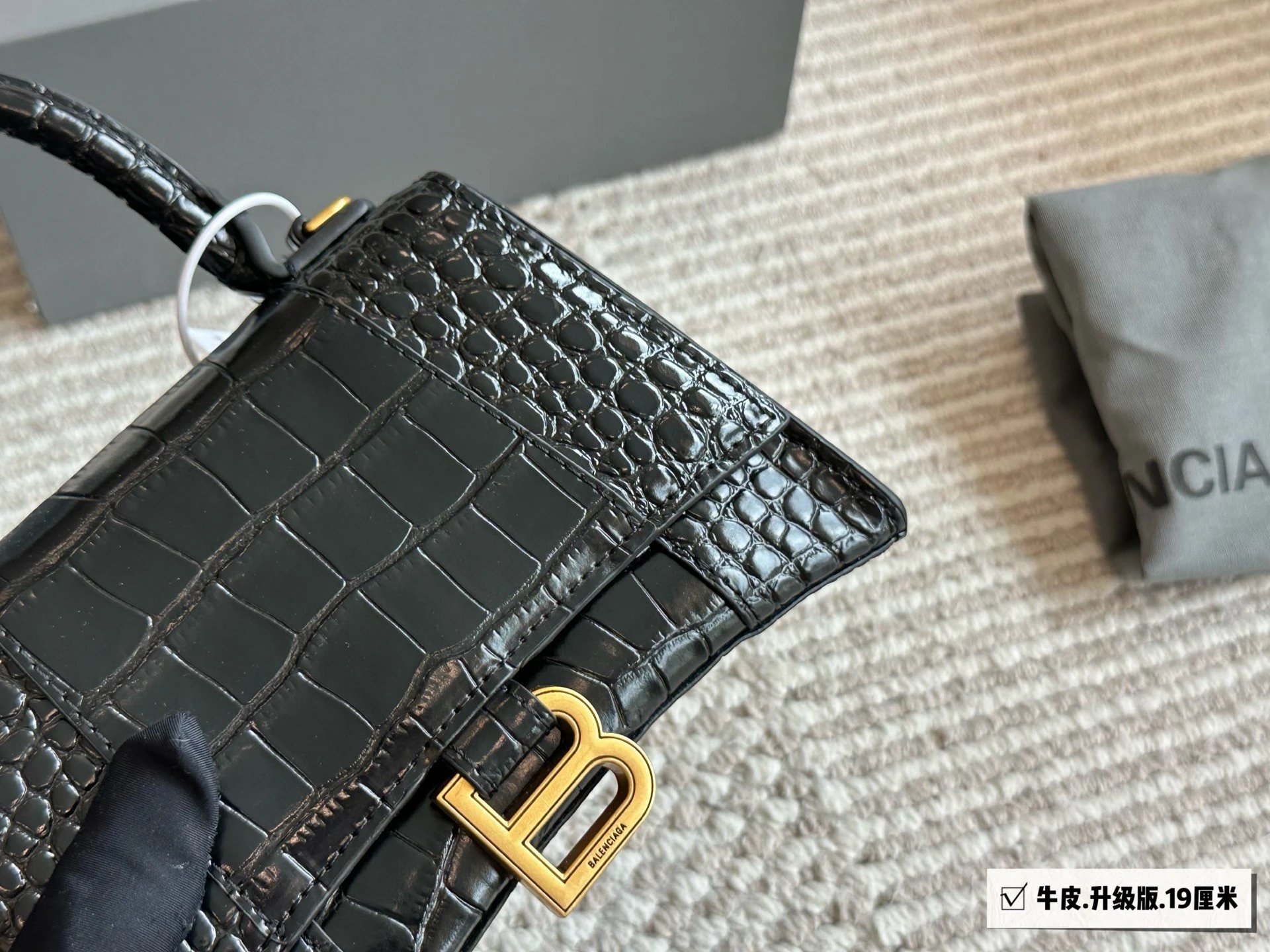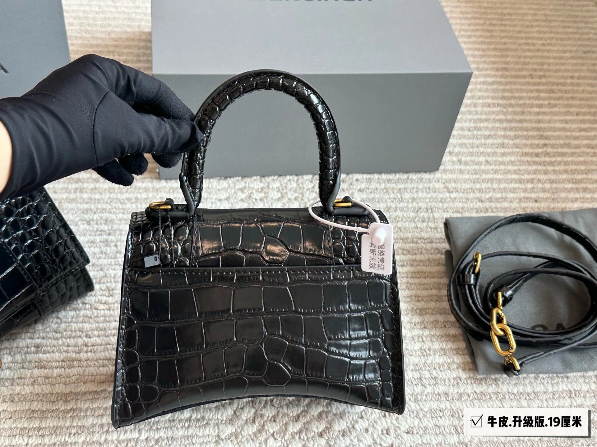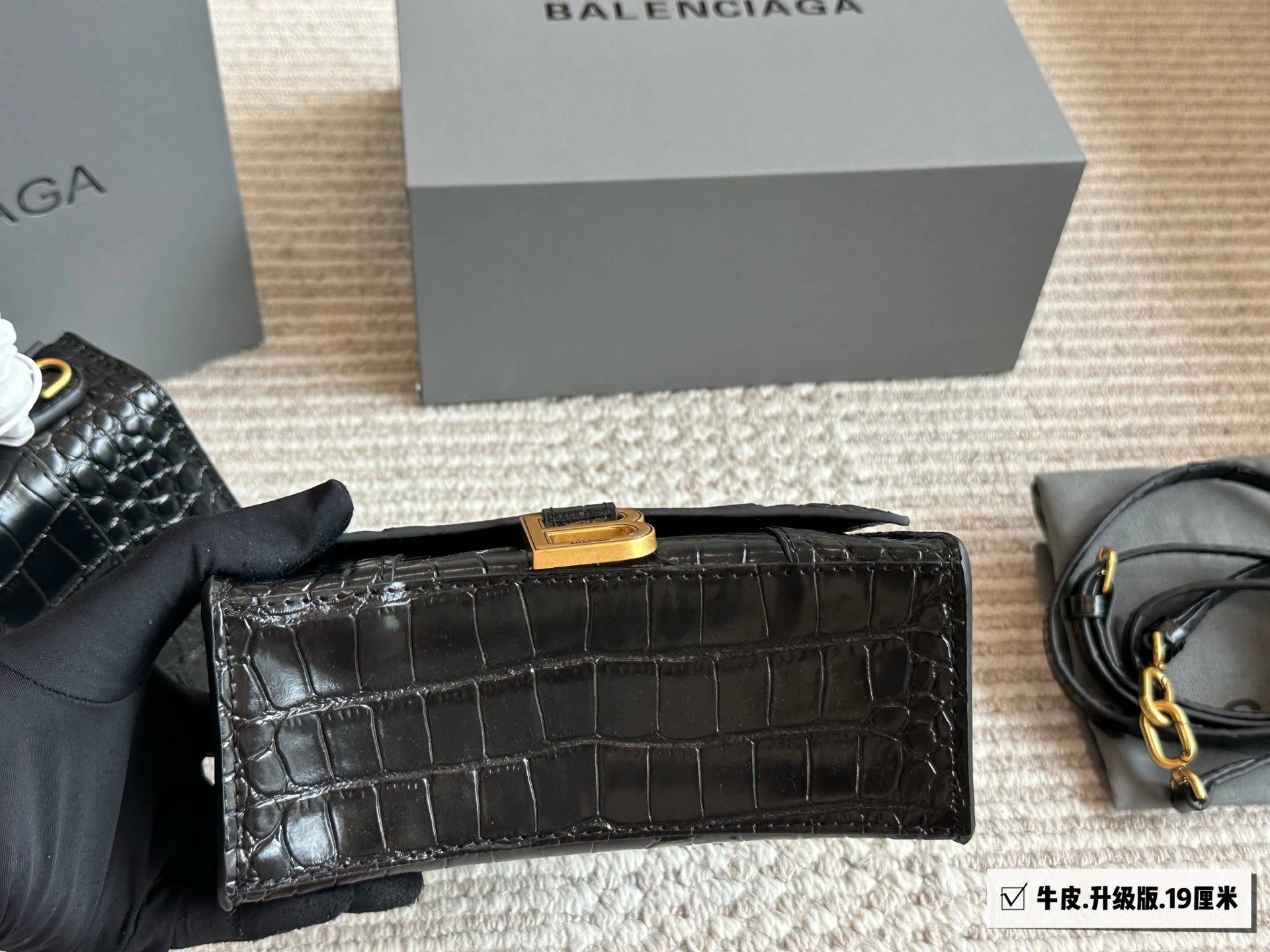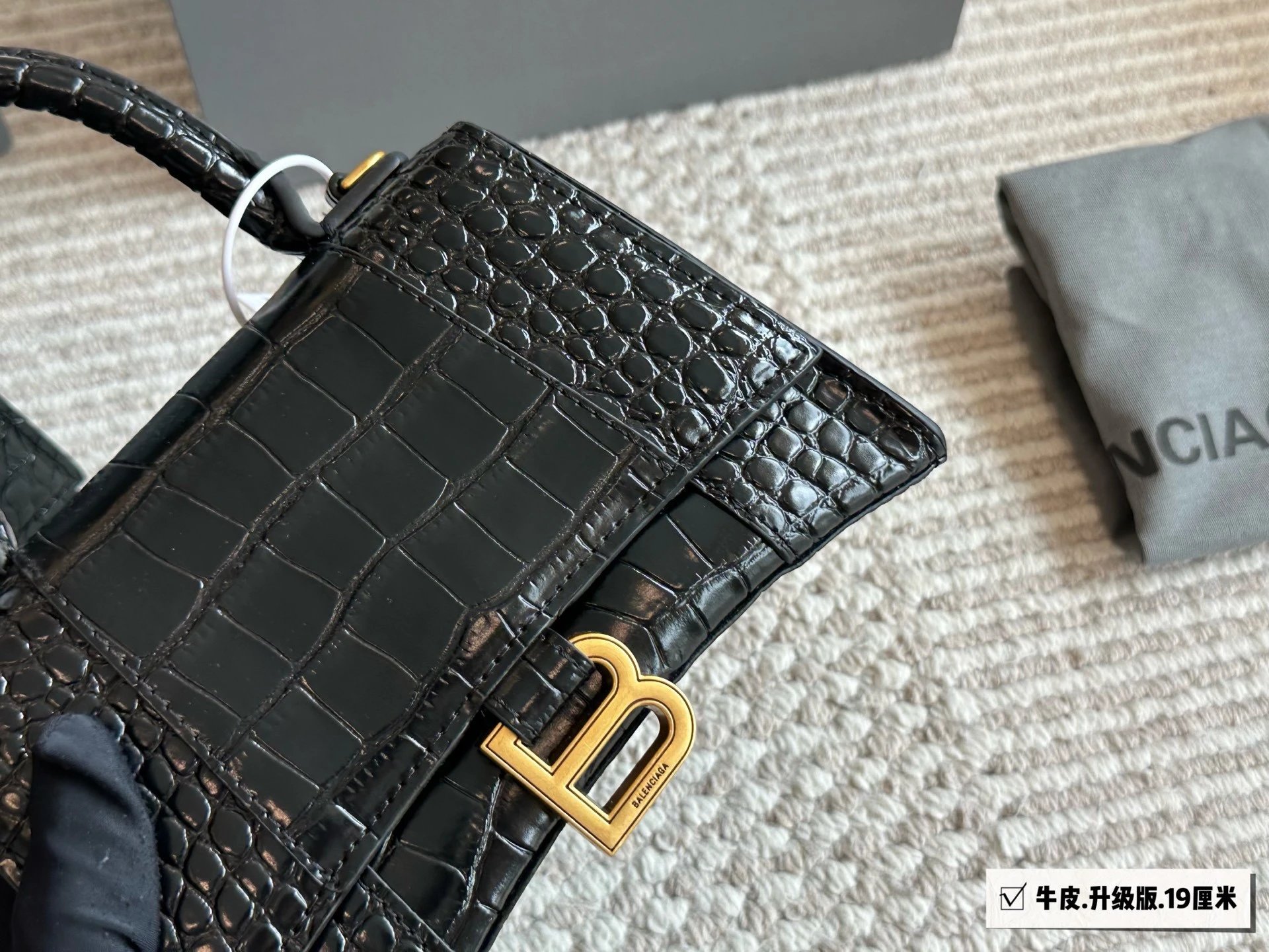 B family hourglass bag hourglass bag Balenciaga hourglass bag Balenciaga handbag Lisa top layer pure cowhide shoulder bag crocodile leather embossed crossbody bag black gold **hardware gravure logo full set of gift box