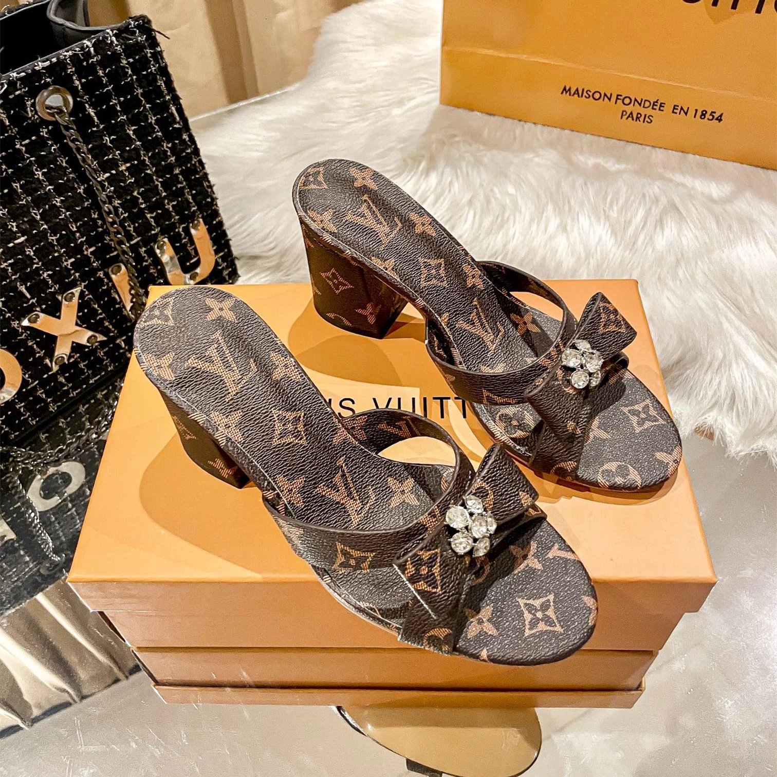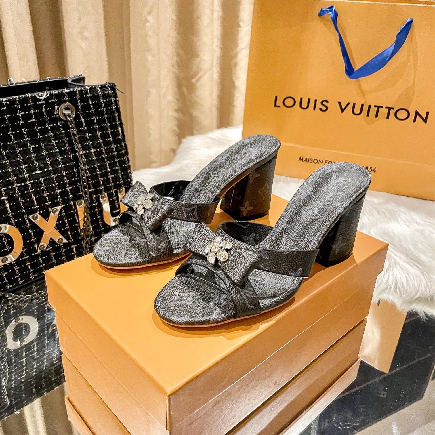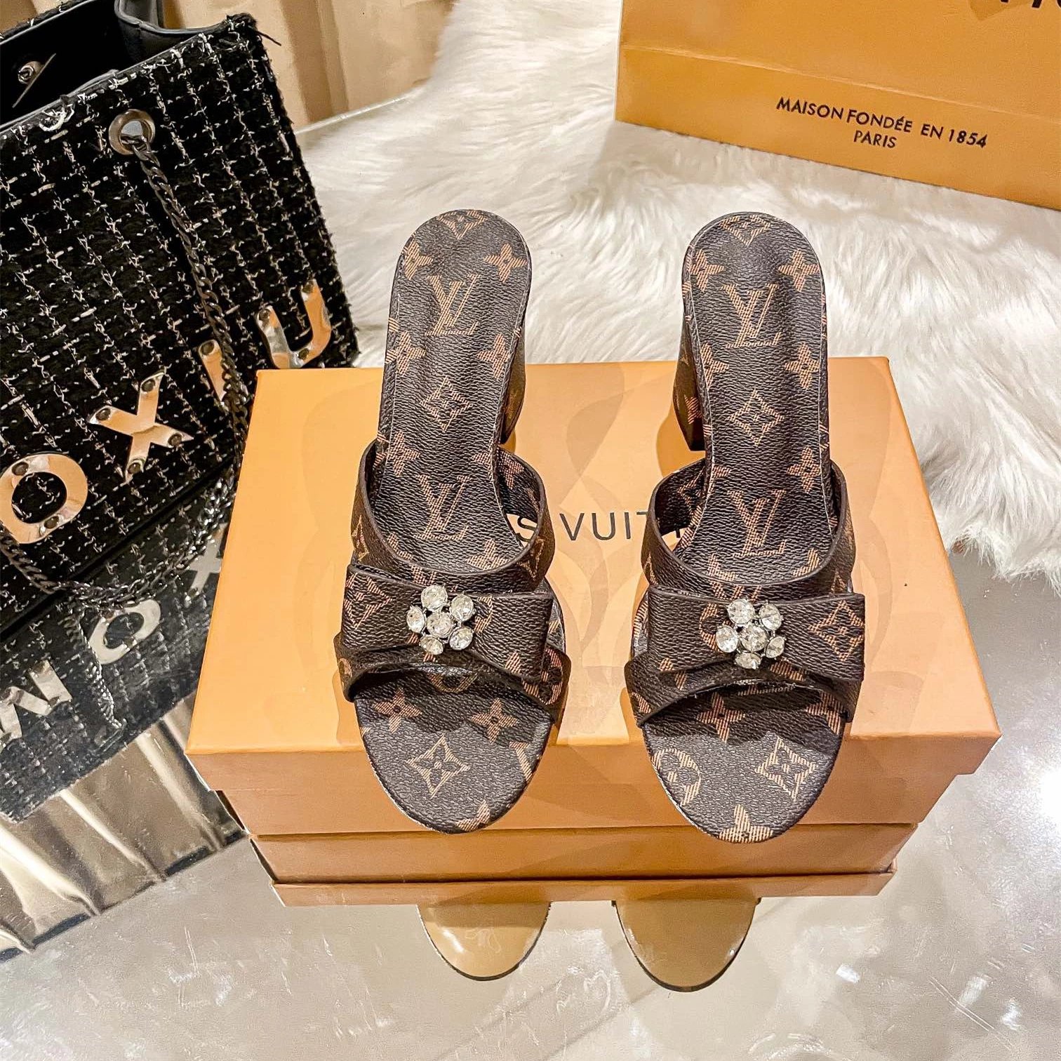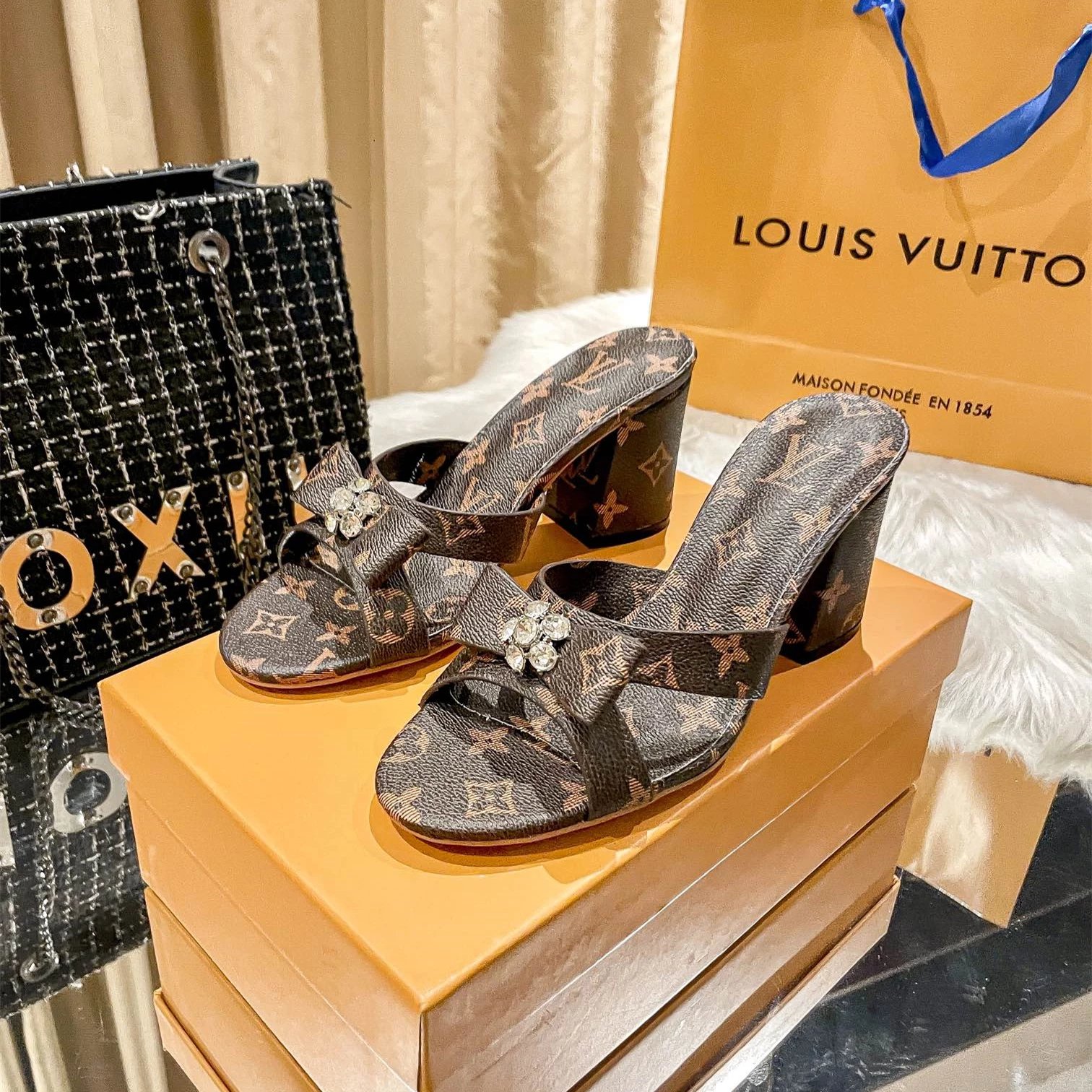High version LV print monogram open toe rhinestone high heel leather soft-soled slippers 2024 old flower