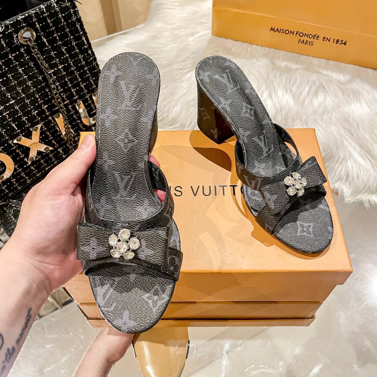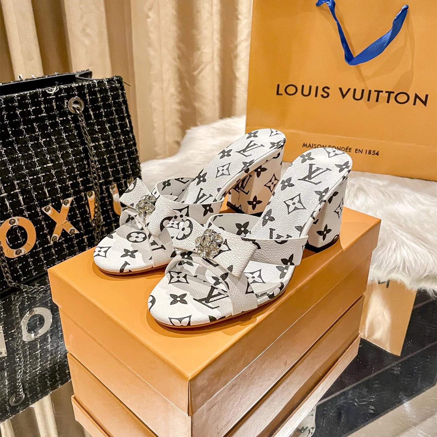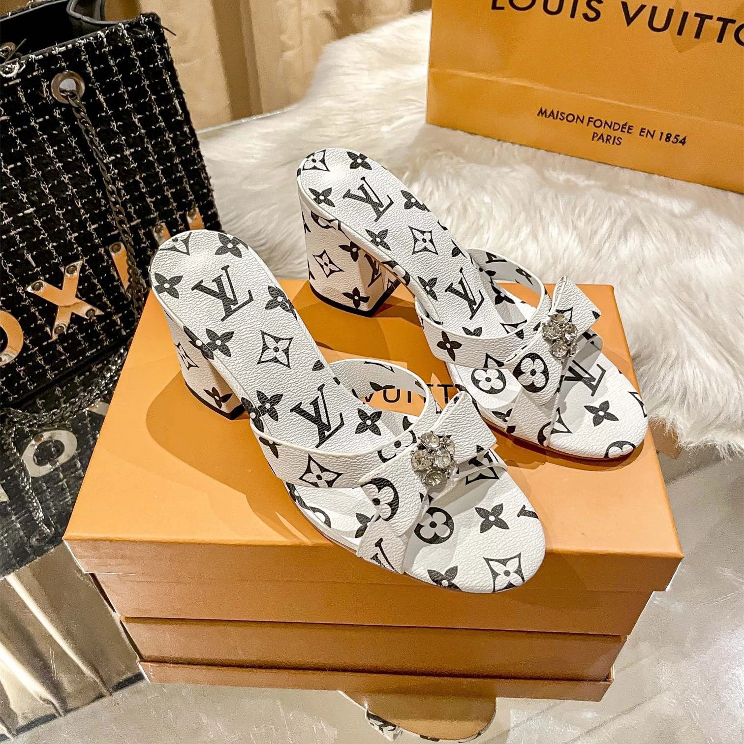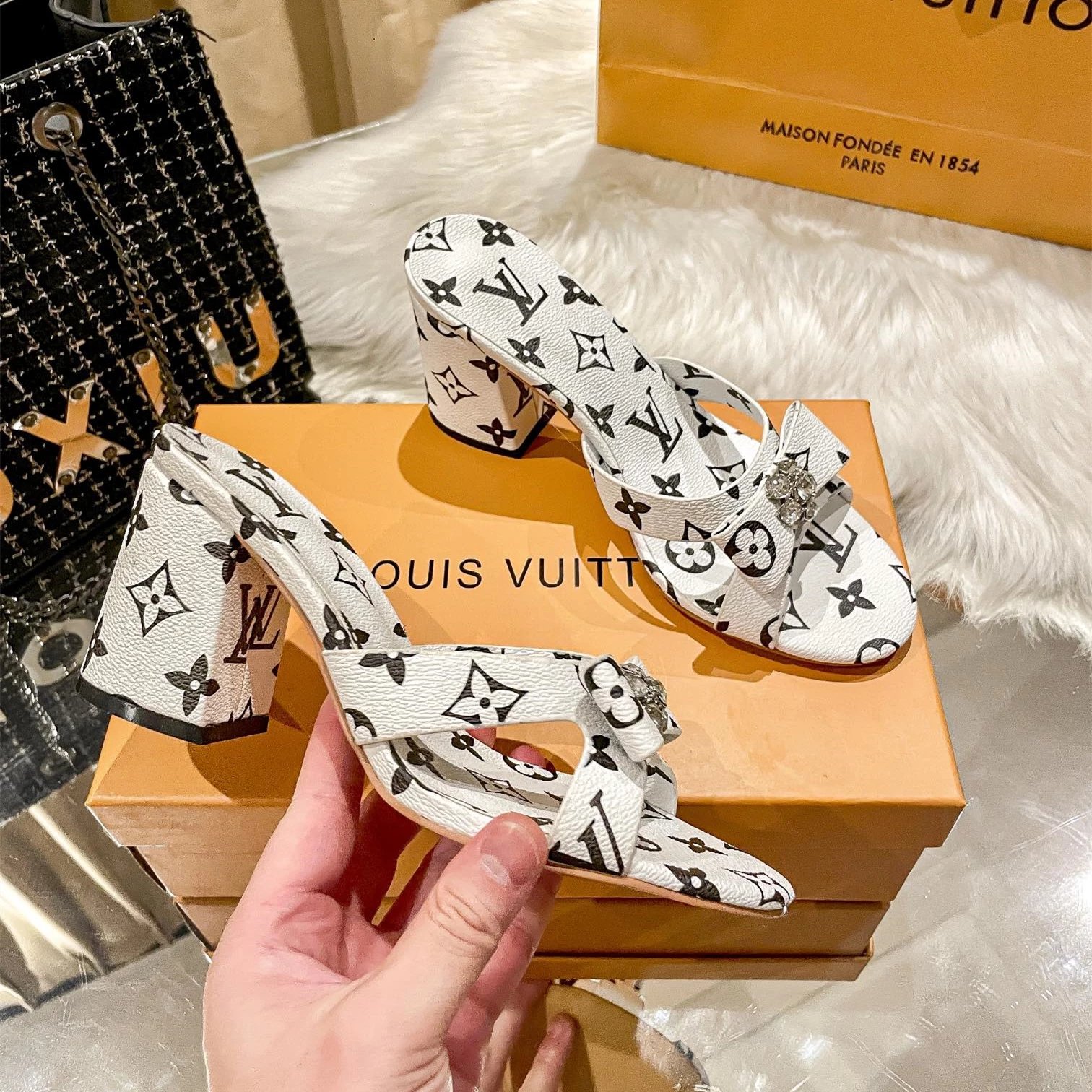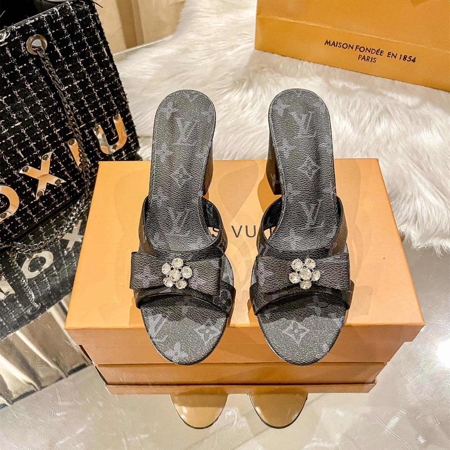 High version LV print monogram open toe rhinestone high heel leather soft-soled slippers 2024 old flower