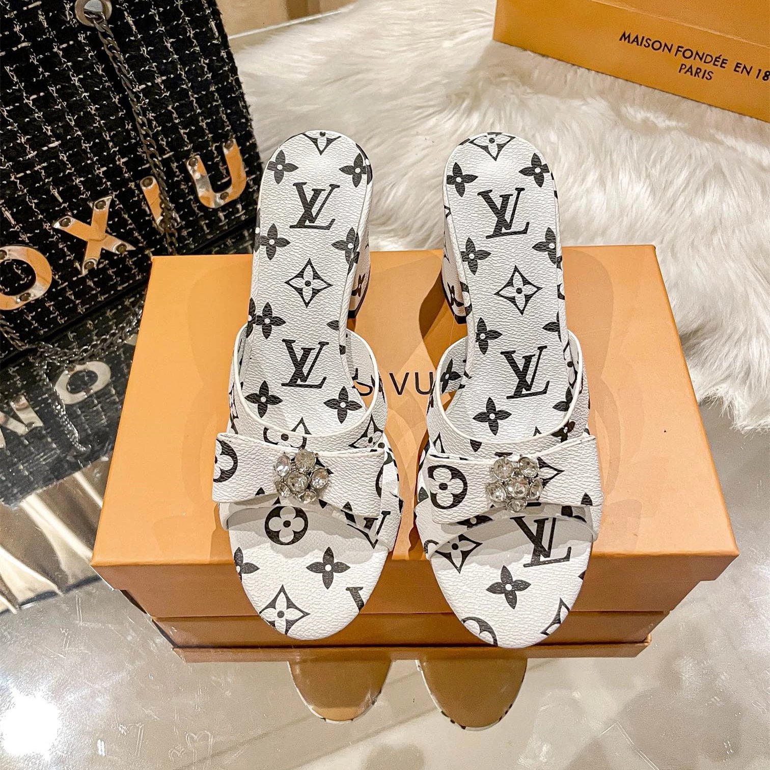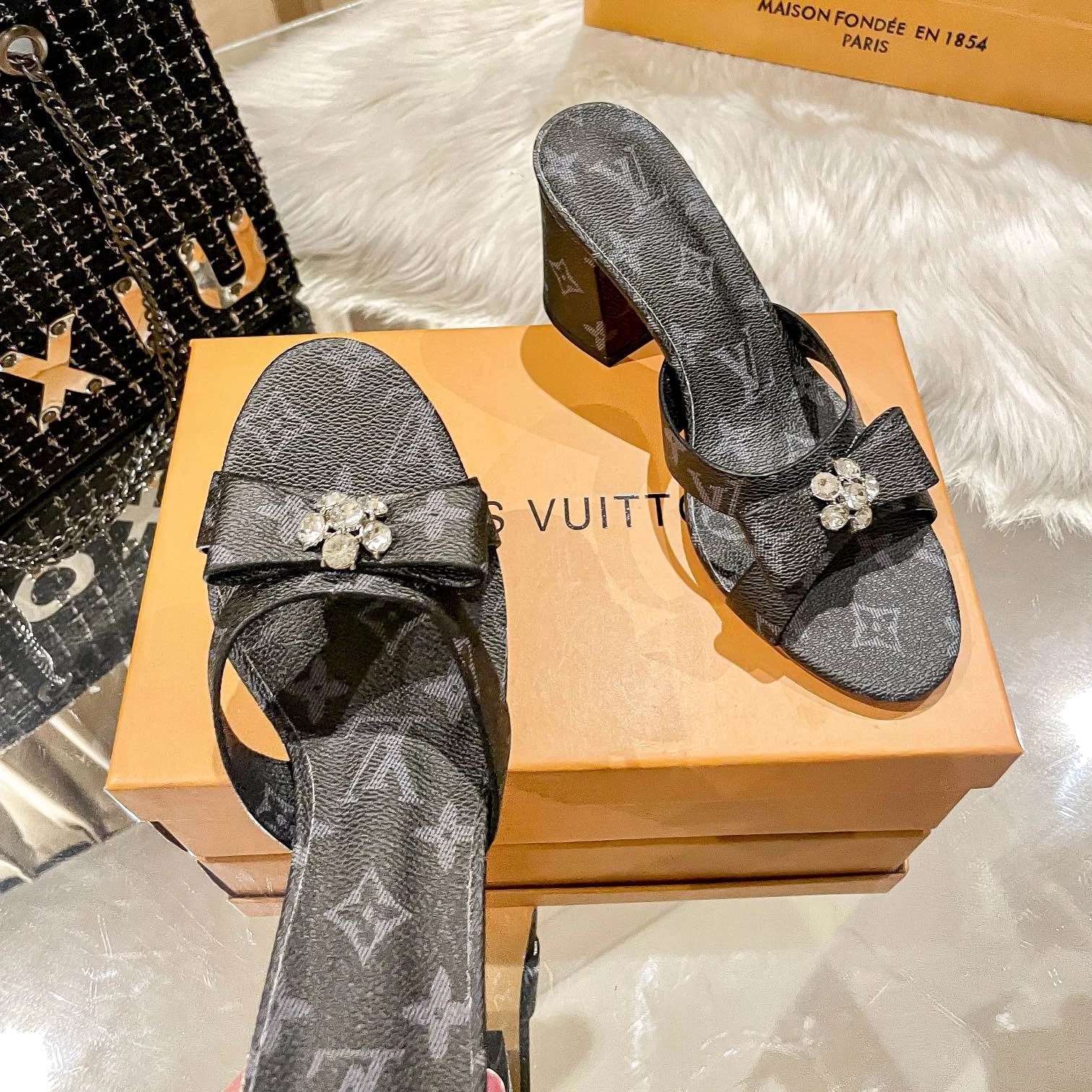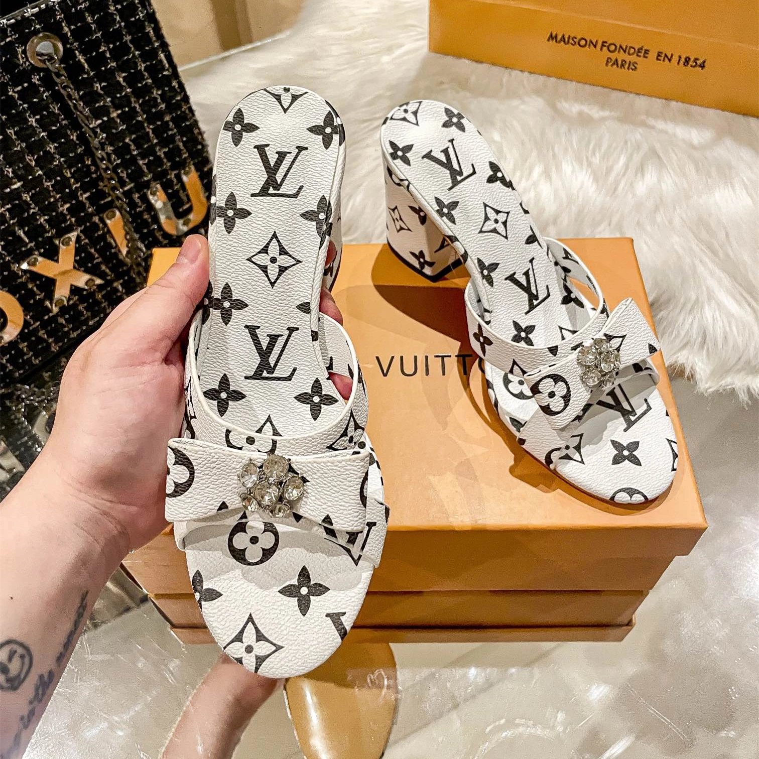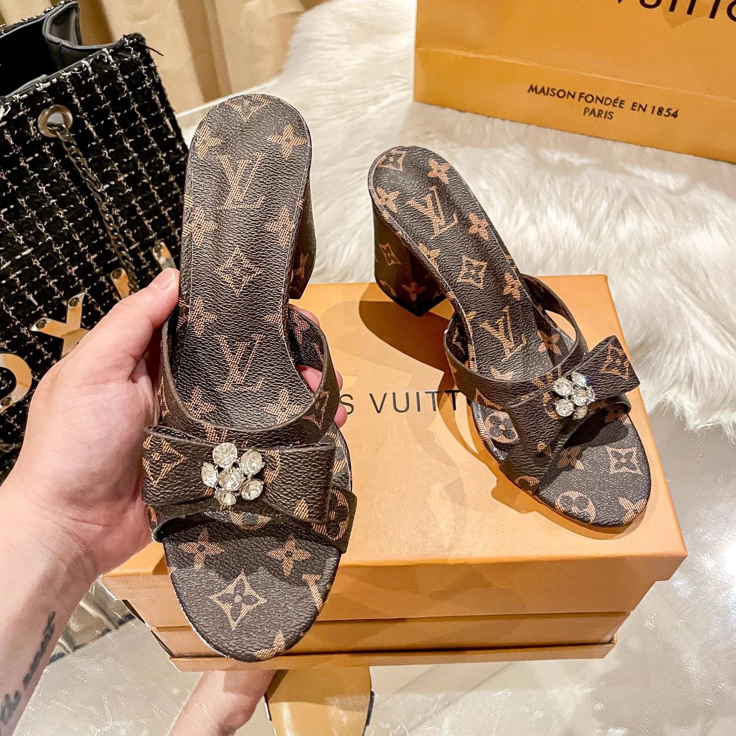 High version LV print monogram open toe rhinestone high heel leather soft-soled slippers 2024 old flower