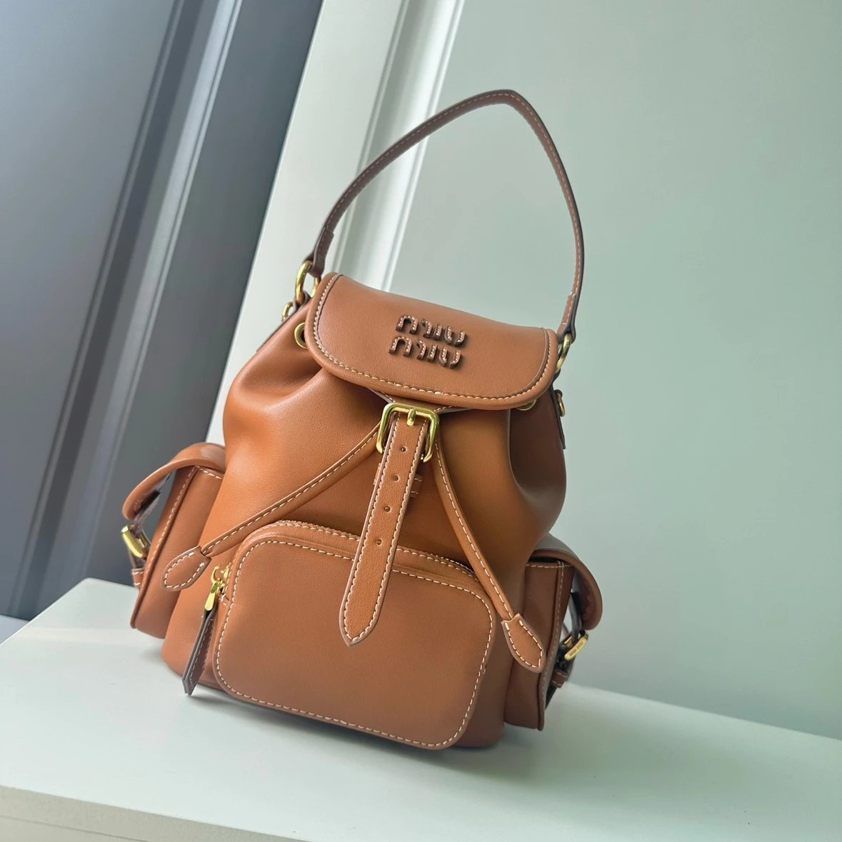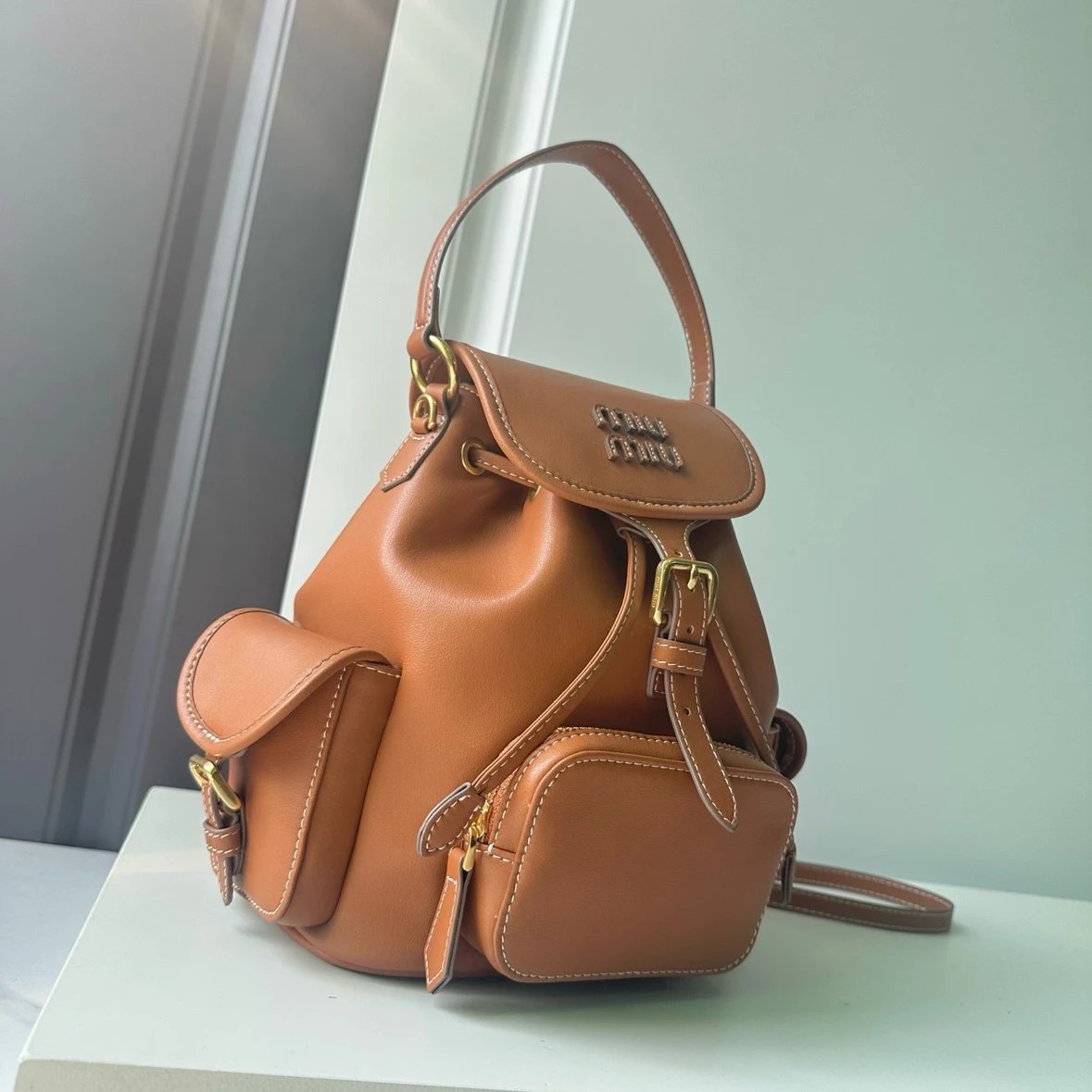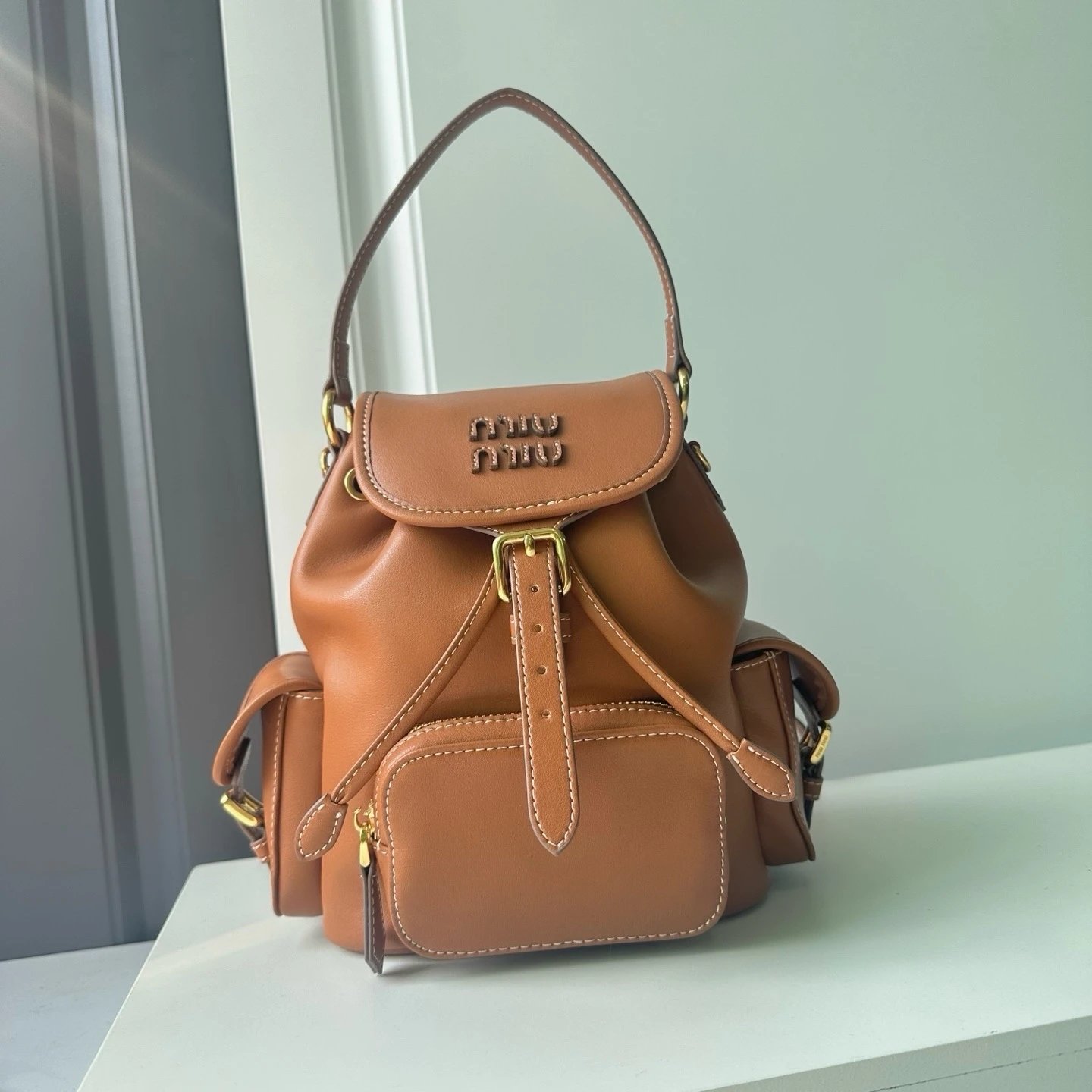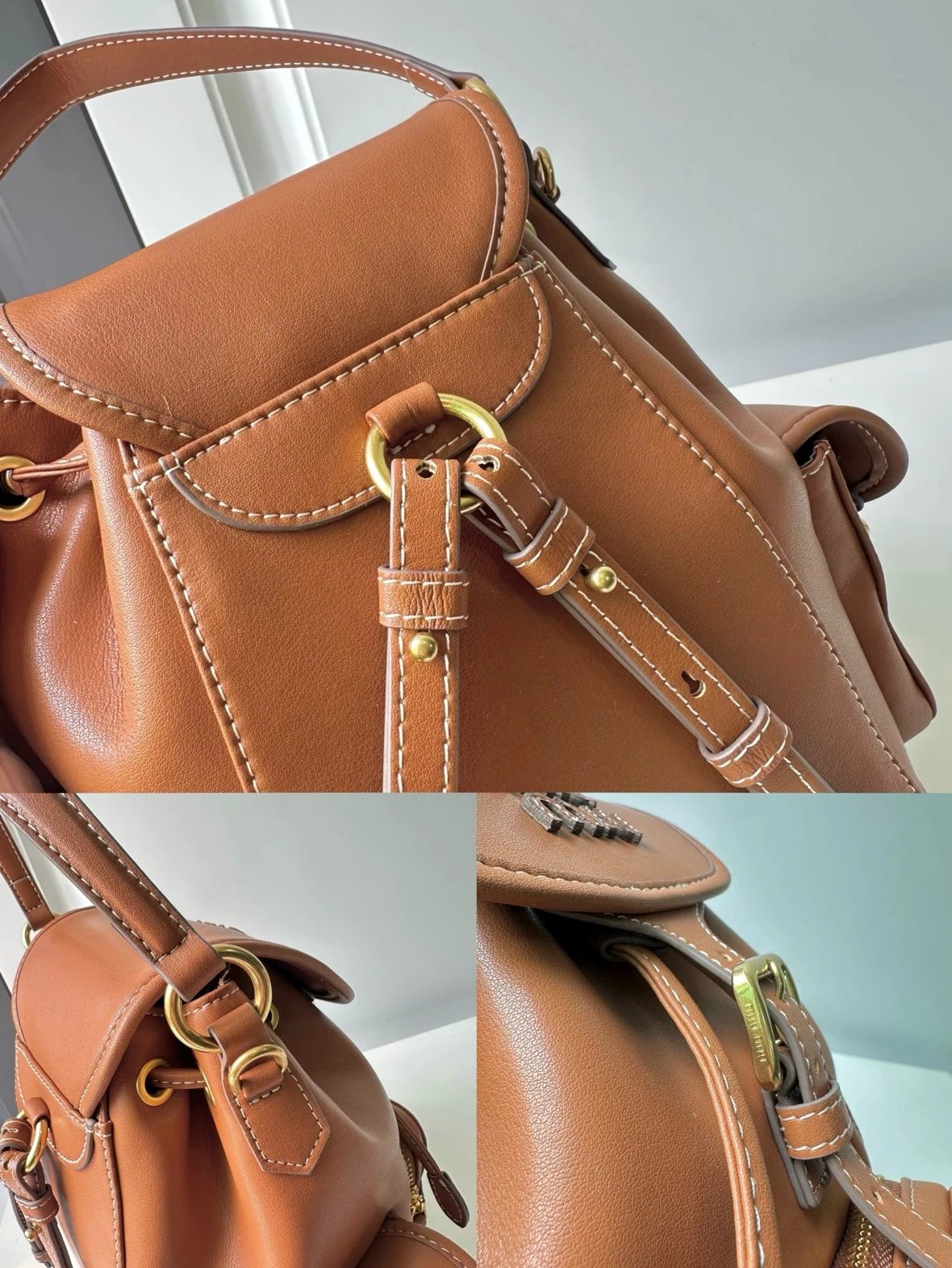 M Logo Gold hardware Calf leather backpack Women's brandy
