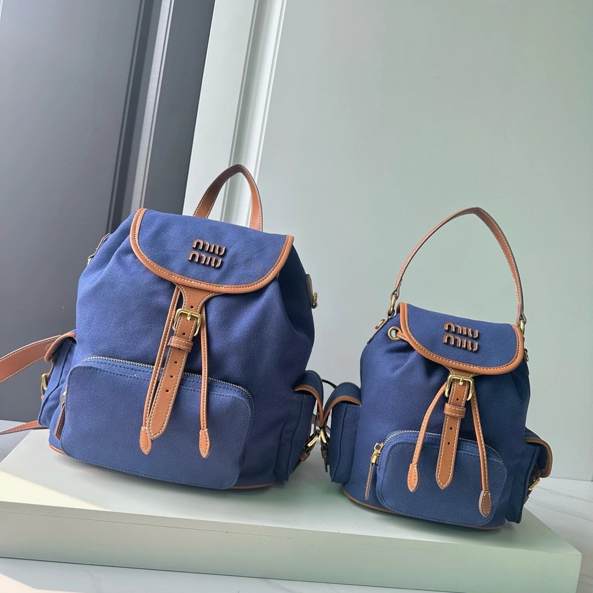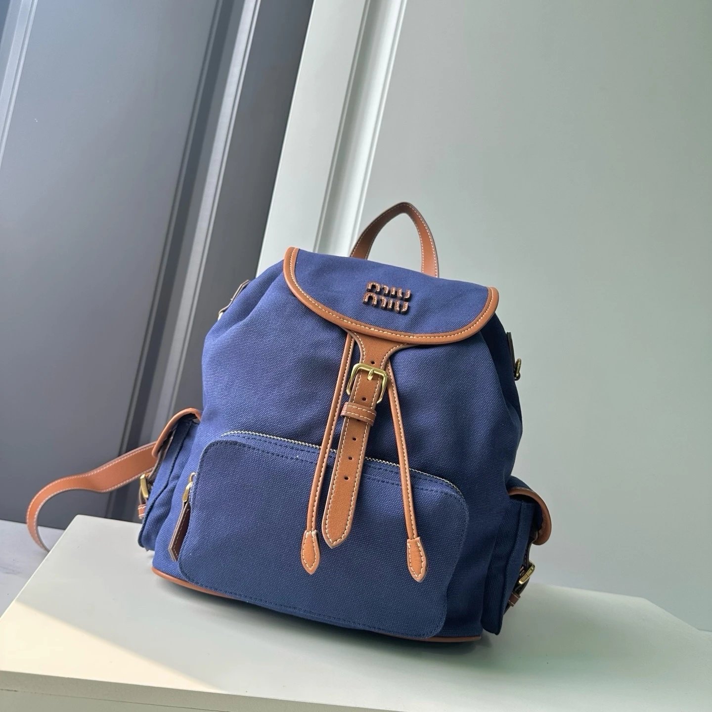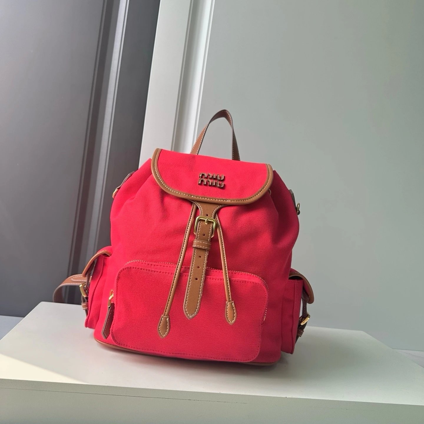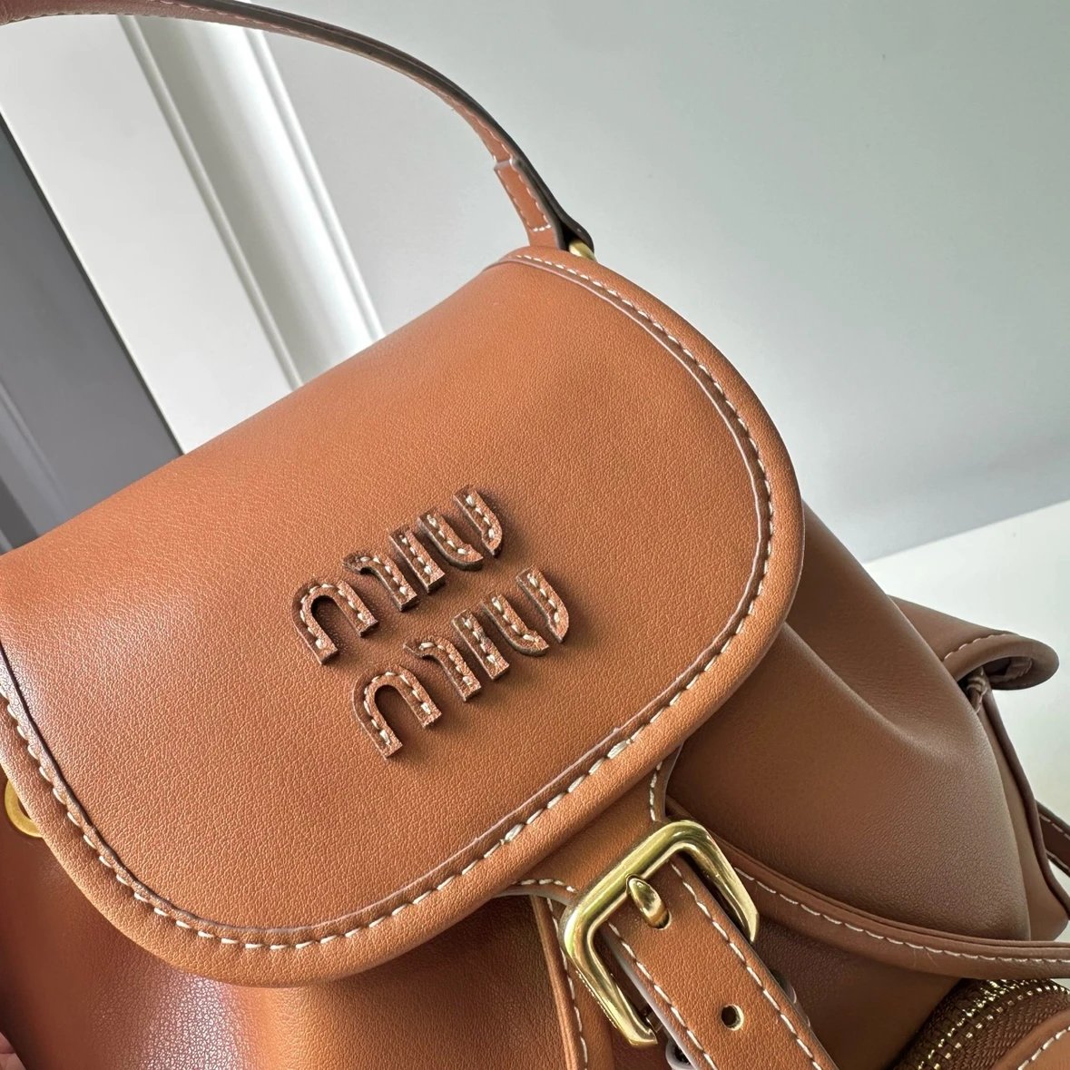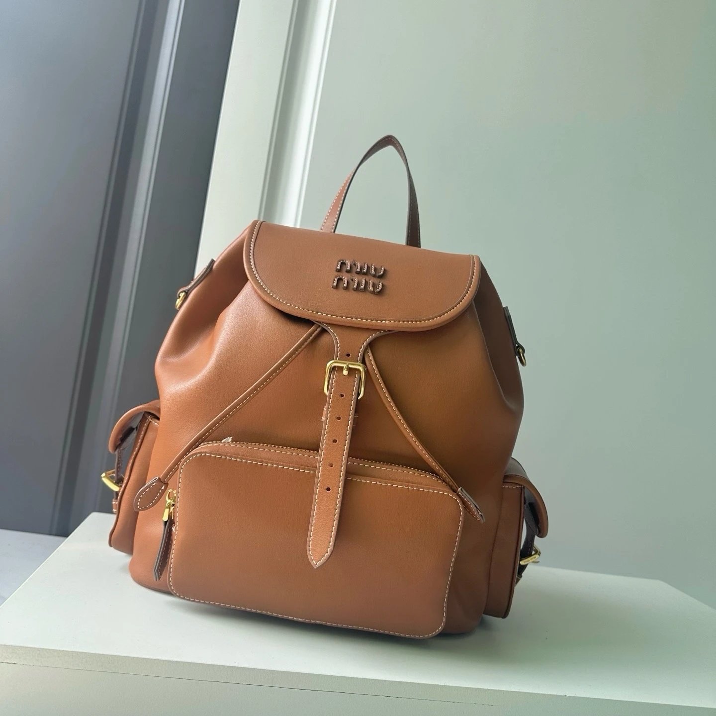M Logo Gold hardware Calf leather backpack Women's brandy