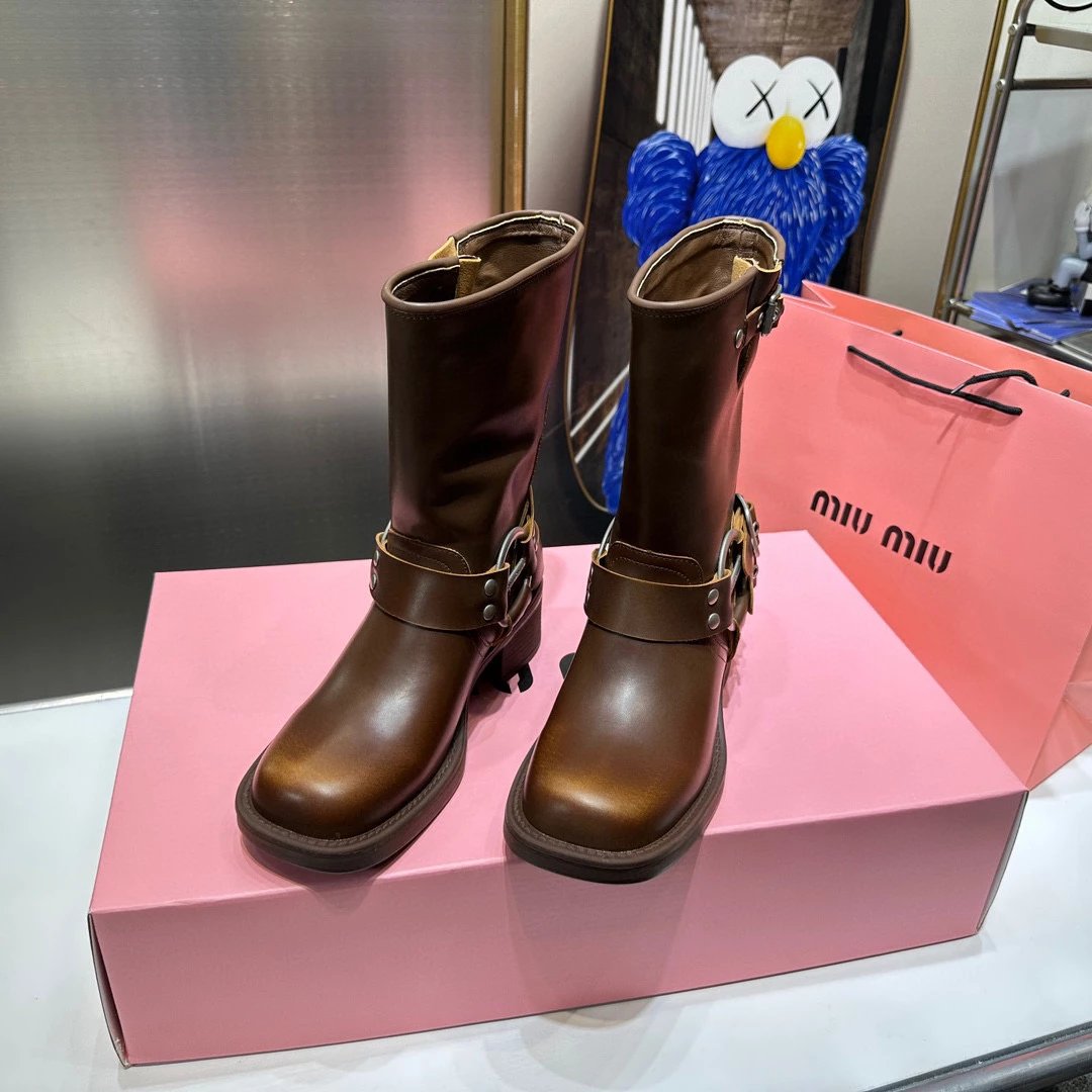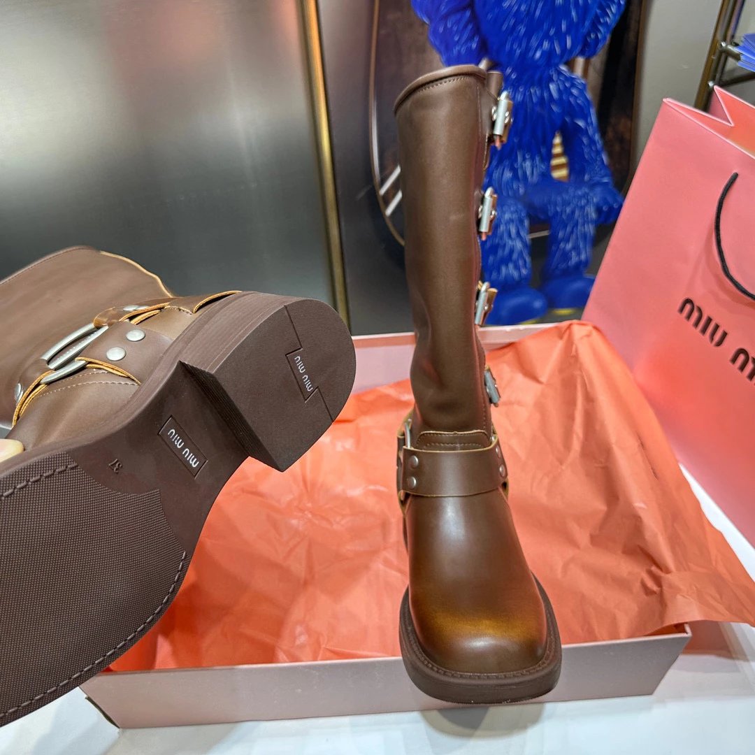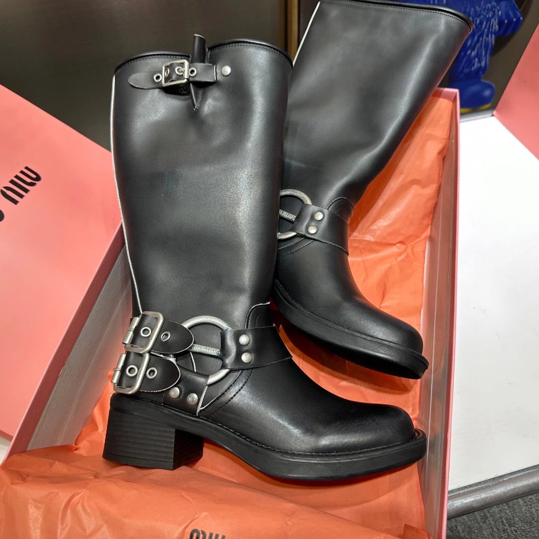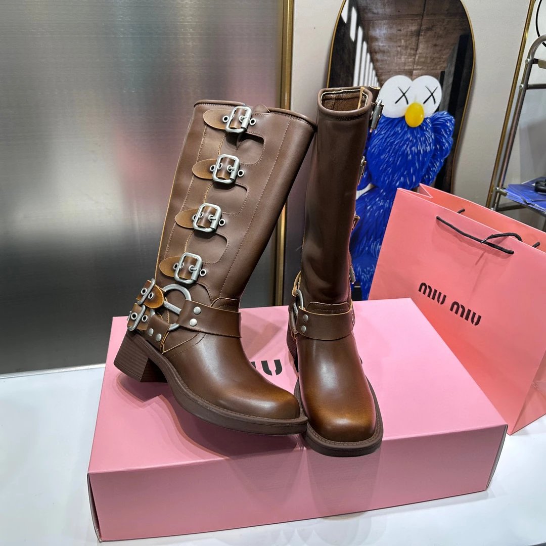 Women's Boots Fall/Winter 2023 New M Family Hand-Erased Vintage Cowhide Square Toe Block Heel Metal Stud Belt Buckle High Knight Boots Western Cowboy Boots