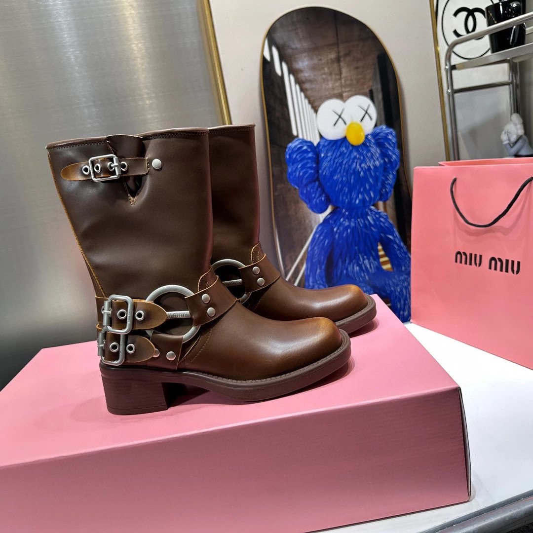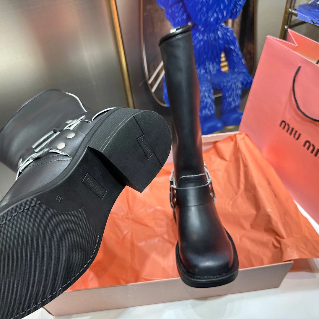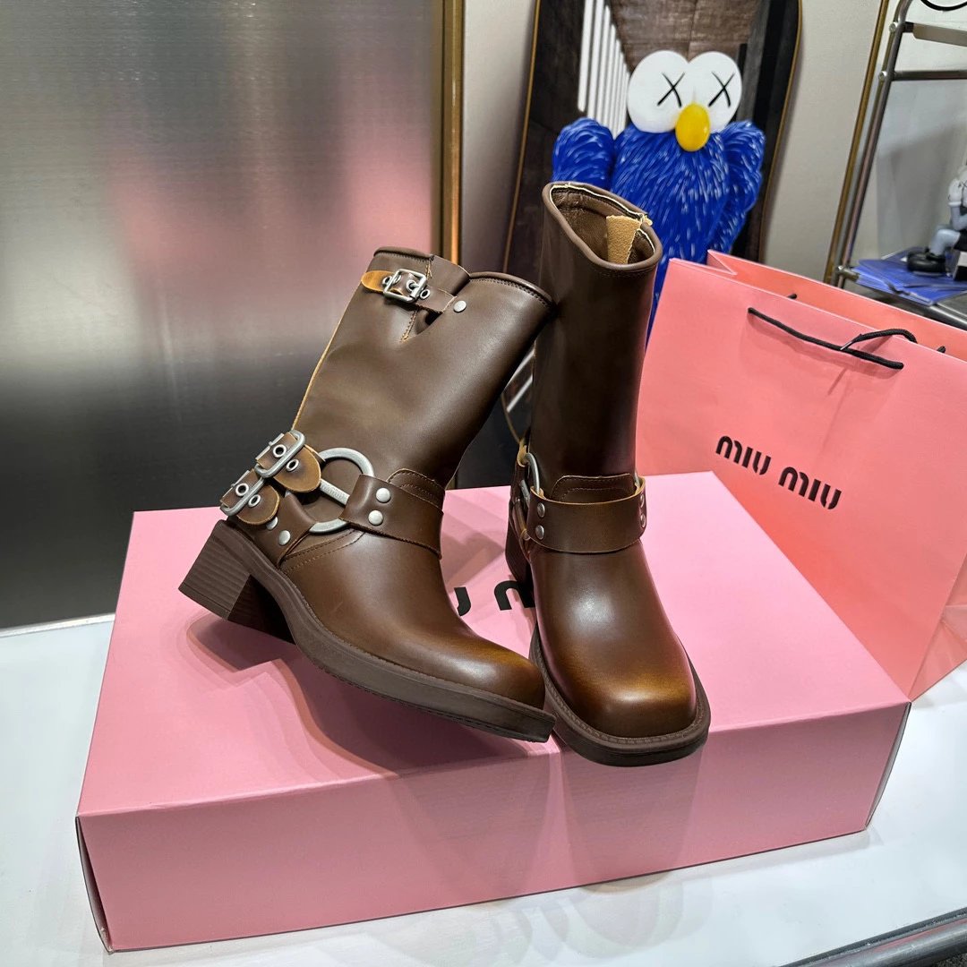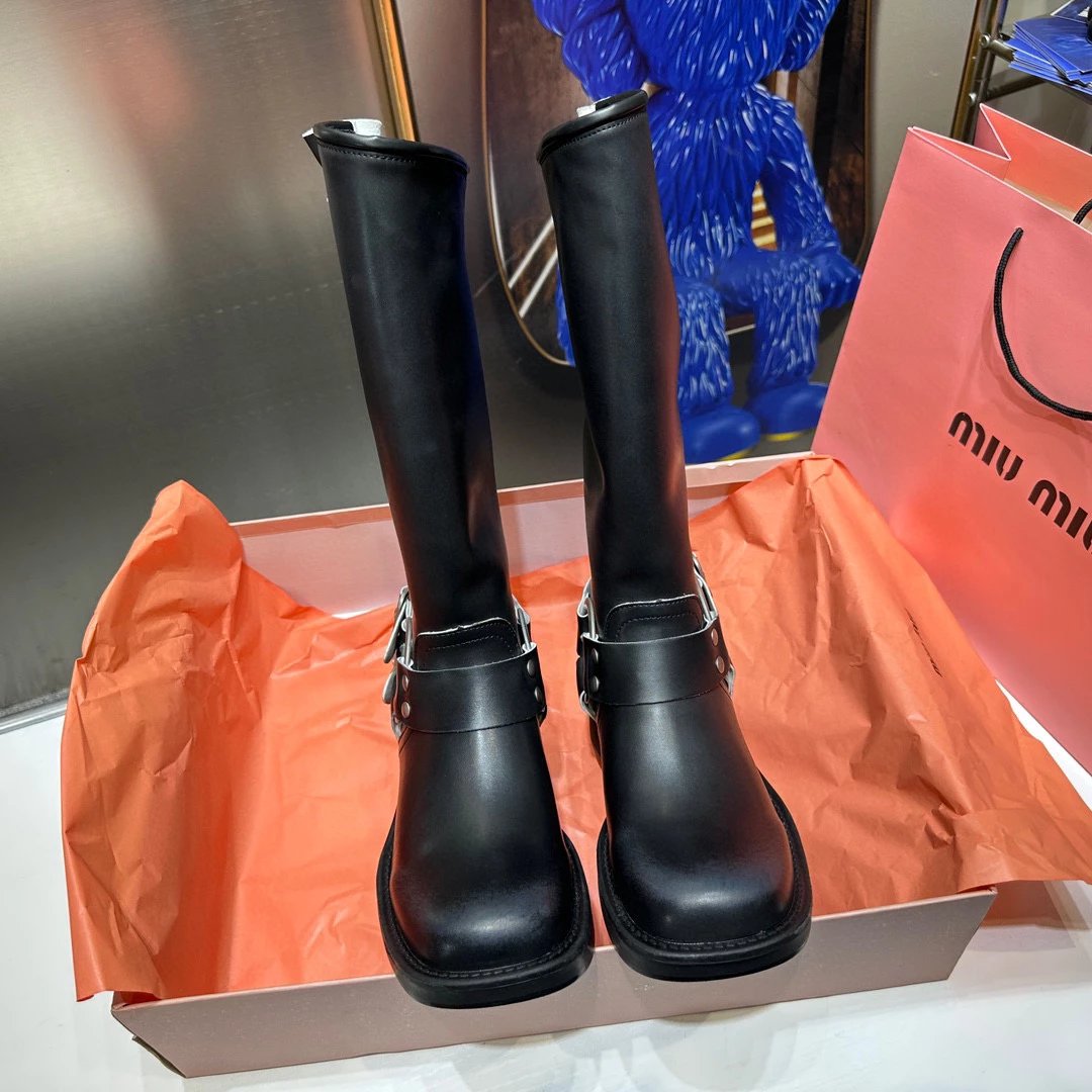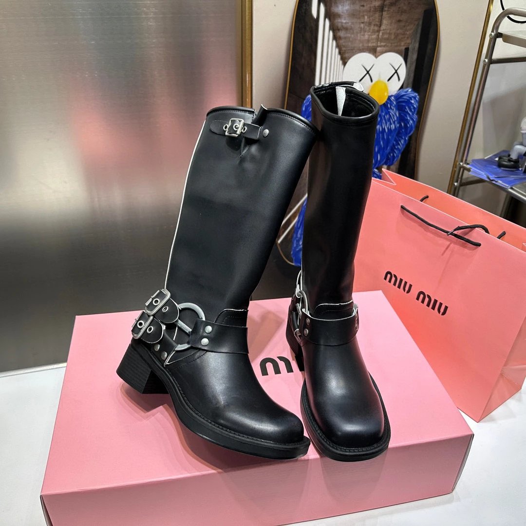 Women's Boots Fall/Winter 2023 New M Family Hand-Erased Vintage Cowhide Square Toe Block Heel Metal Stud Belt Buckle High Knight Boots Western Cowboy Boots