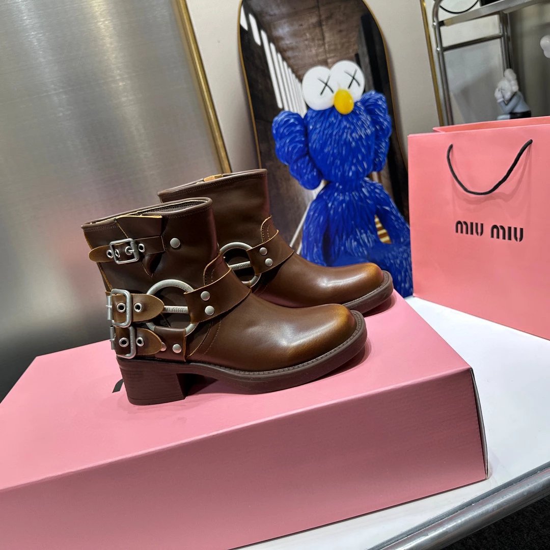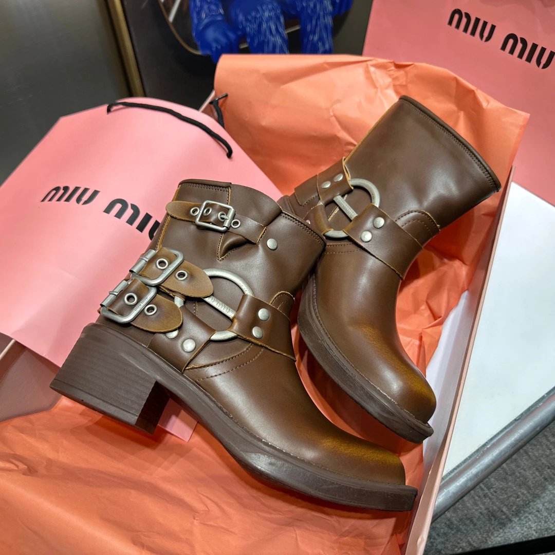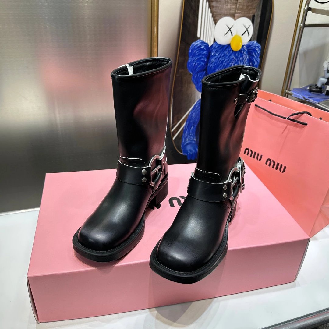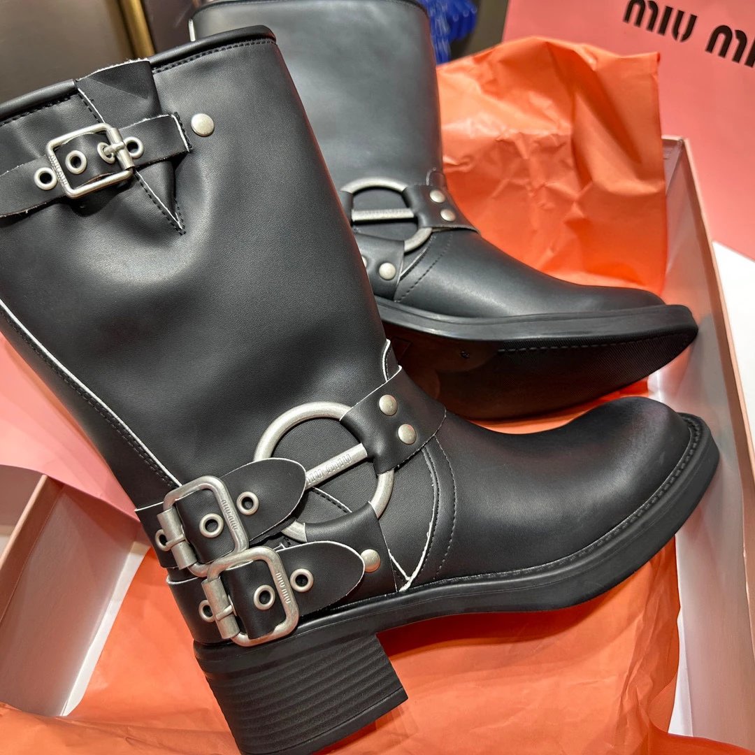 Women's Boots Fall/Winter 2023 New M Family Hand-Erased Vintage Cowhide Square Toe Block Heel Metal Stud Belt Buckle High Knight Boots Western Cowboy Boots